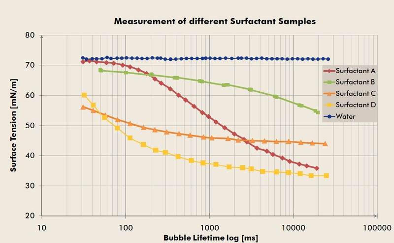 设备的压力传感器给予一定的压力,在毛细管口(液体内部)形成一个新的气泡。通过控制该气泡的不同的有效留存时间(bubble lifetime气泡寿命),得到不同的表面张力值的测定,并呈现完整的动态表面张力的动态变化曲线。