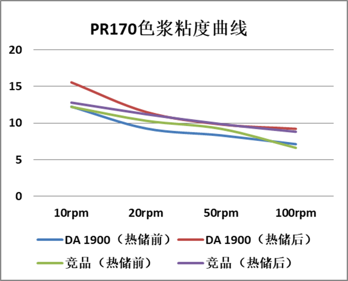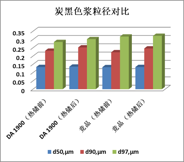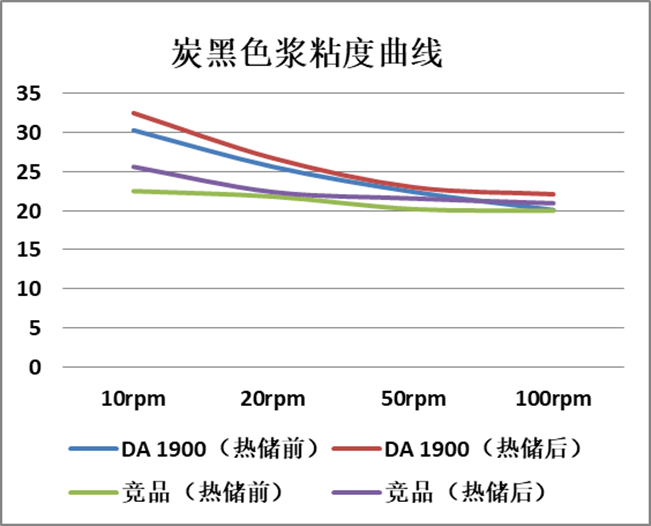 从以上结果可以看出,DA 1900对炭黑颜料有优异的降粘效果,提供良好的储存稳定性和黑度。