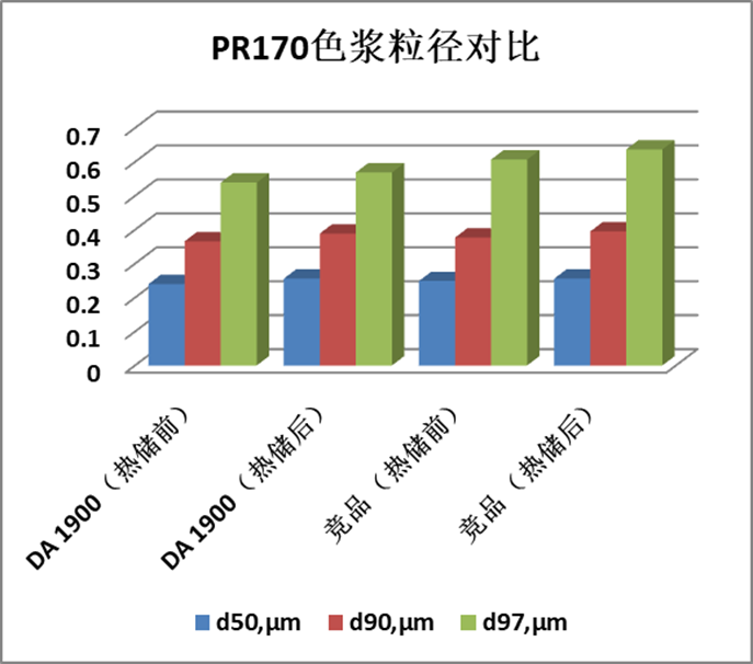 从以上结果可以看出,DA 1900对RP170红颜料有优异的分散效果和储存稳定性,并提供良好的色彩鲜艳度,饱和度。钛白冲淡着色力强。
