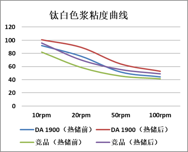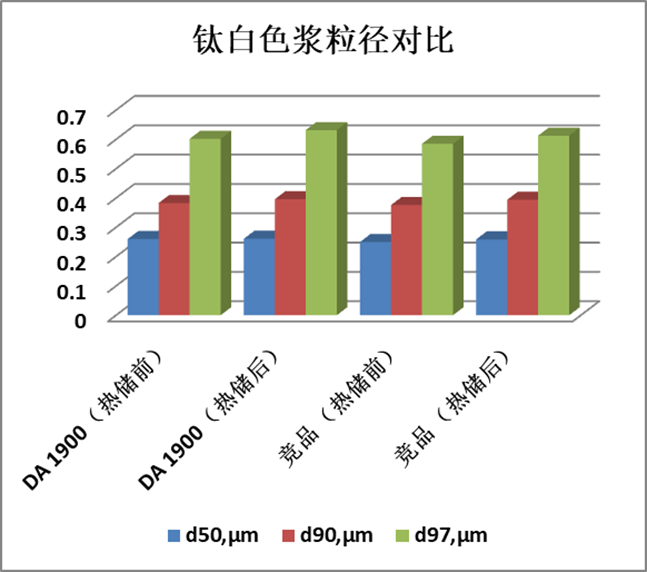 从以上图表可看出,DA 1900对钛白粉降粘效果好,可以制备70%的高颜料含量钛白色浆,并且色浆的稳定性优异,50℃热储7天后钛白粒径稳定,粘度稳定。同时提供高的白度和强遮盖力。